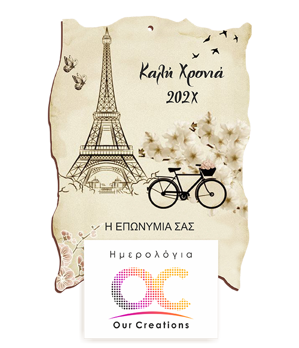 Η παριζιάνικη ατμόσφαιρα, γεμάτη ρομαντισμό, κομψότητα και διαχρονική αισθητική, χαρίζει στο ημερολόγιο αυτό μια ιδιαίτερη και γοητευτική αύρα. Η σύνθεση με τον Πύργο του Άιφελ, το ποδήλατο και τα λουλούδια δημιουργεί ένα ονειρικό σκηνικό που αποπνέει ηρεμία, φινέτσα και ταξιδιάρικη διάθεση, καθιστώντας το μια ξεχωριστή επιλογή για επιχειρήσεις, συλλόγους και οργανισμούς που επιθυμούν να προσφέρουν ένα ημερολόγιο με κομψό και καλαίσθητο χαρακτήρα.